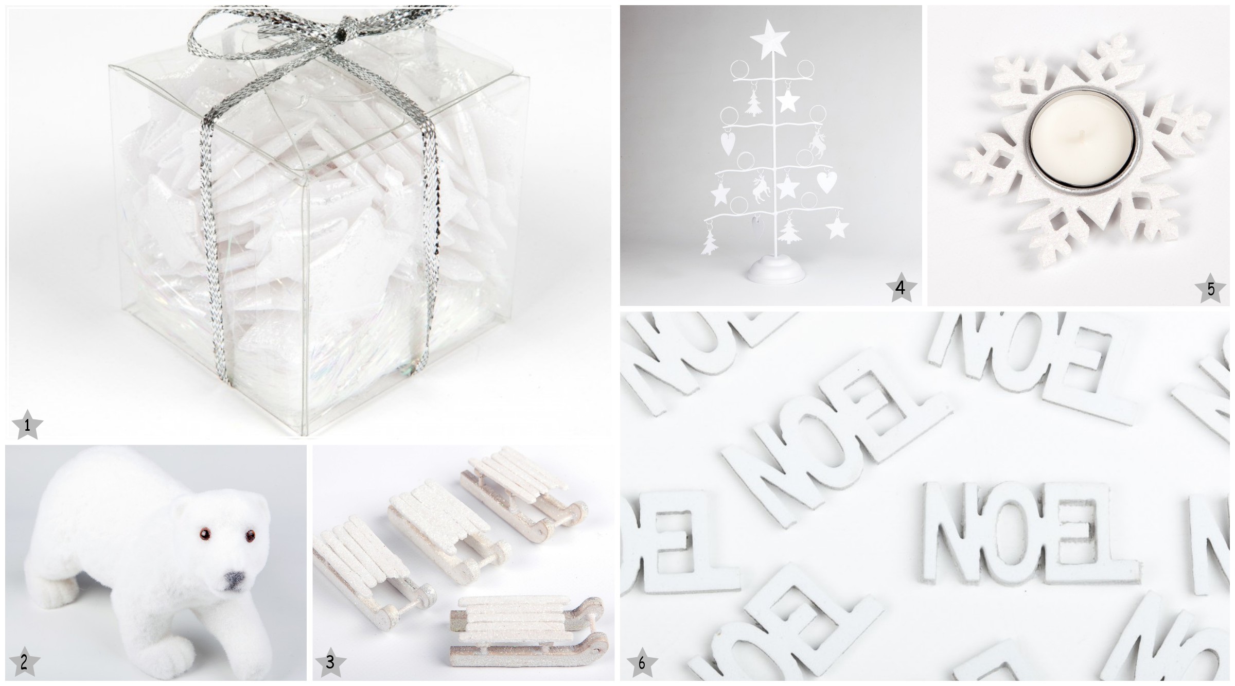 1- Boite d'étoiles en 3D blanches 2- Centre de table ours polaire 3- Petites luges blanches pailletées 4- Sapin centre de table blanc 5- Bougeoir flocon blanc 6- Mots Noël blanc
