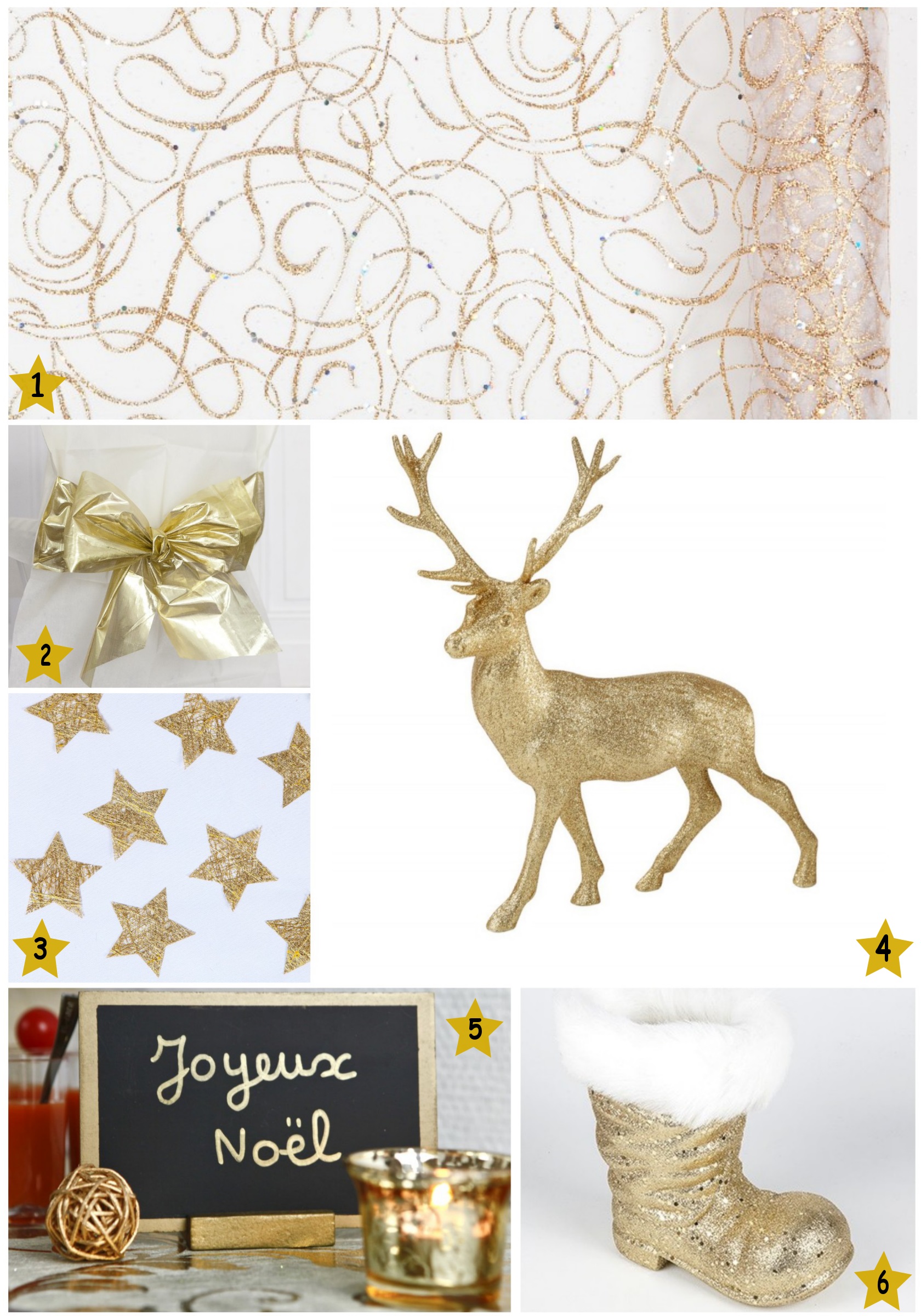 1- Chemin de table motifs or ondulés 2-Housse de chaise avec noeud métallisé 3- Etoiles en intissé or 4- Grand cerf doré pailleté de Noël 5- Grande ardoise marque-table or or 6- Botte de père Noël grand modèle or