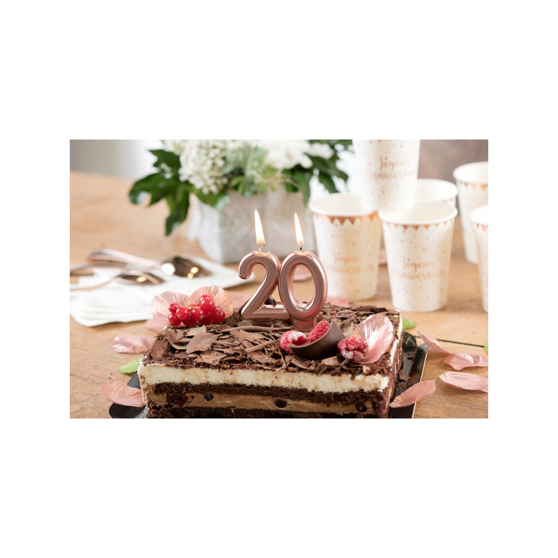Bougie chiffre 20 rose goldJolie bougie 20 ans coloris rose gold Parfait pour un anniversaire chic et tendance ! Cette grande bougie trouvera facilement sa place sur votre gâteau d'anniversaire. Vous pouvez agrémentez votre décoration de table avec un chemin de table rose gold, bougeoir, vaisselle jetable, nappe... pour une harmonie parfaite.1,90 €